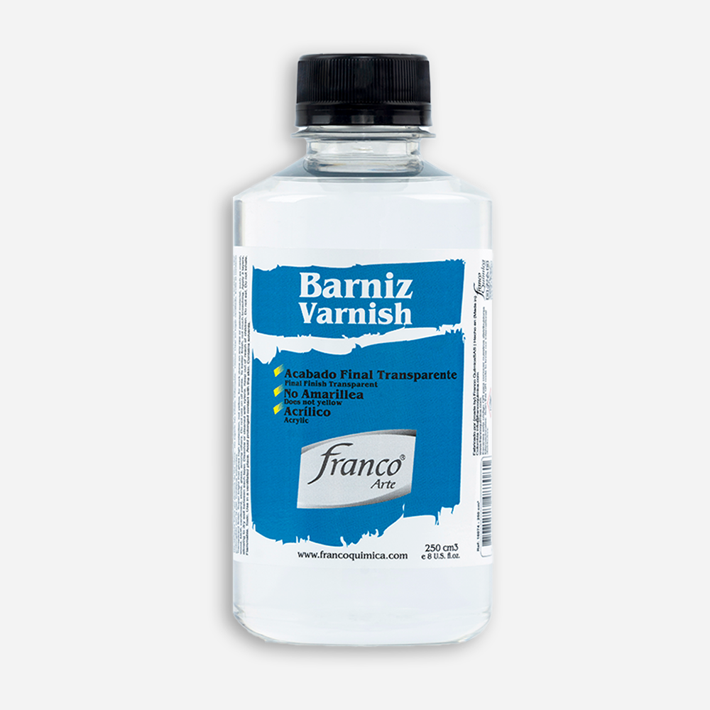 El Barniz Franco Arte es un recubrimiento transparente de alto brillo, ideal para proteger y realzar el acabado de tus piezas artísticas o manualidades. Gracias a su formulación base solvente, proporciona una capa resistente, duradera y de gran luminosidad, que realza los colores y protege contra el desgaste del tiempo.