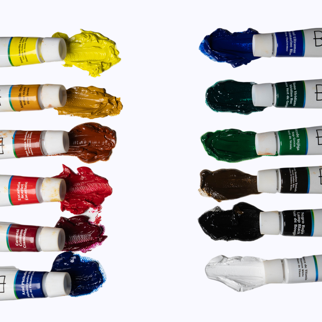 Blanco de Titanio, Negro Carbón, Amarillo Ocre, Tono Amarillo Limón, Tono Sombra Tostada, Tono Siena Tostada, Azul Ultramar, Azul Thalo, Tono Rojo Cadmio, Verde Vejiga, Tono Naranja Cadmio y Magenta.